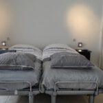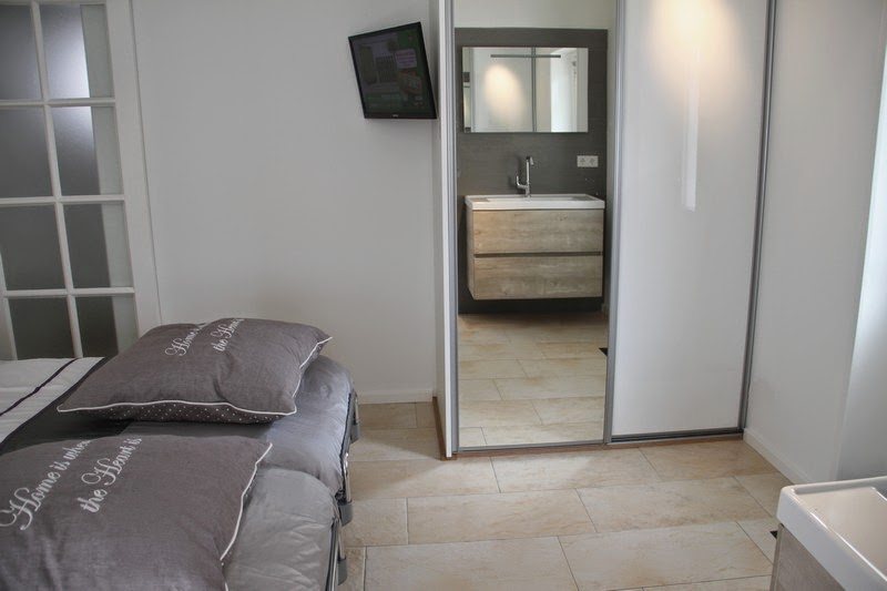 Slaapkamer afgescheiden door schuifdeur, indeling: luxe 2 x 1 persoons aupingbed 90 x 210cm met flatscreen tv,wastafelmeubel, moderne douche en wc..